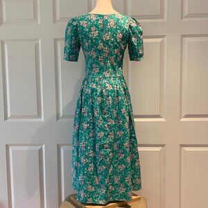 This is a very pretty short sleeve, summery cotton dress made by the iconic Laura Ashley. Color is a turquoise blue-green, with pink and white flowers on it. The dress has some lovely design touches, such as the folded shoulder (see picture), bateau neckline, and Basque waistline. There is a zipper in the back and both sides have pockets. The dress has no rips, tears or stains, and is in excellent pre-worn condition.