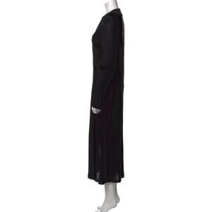 The dress is available in size large and is designed to flatter with its fit and flare style. It is black in color and has a solid pattern, making it a classic and timeless piece. The dress is made in the United States and should be dry cleaned only. This Y2K dress is perfect for those who love to make a statement with their fashion choices. There are minor picks in the dress but really don’t show when wearing.