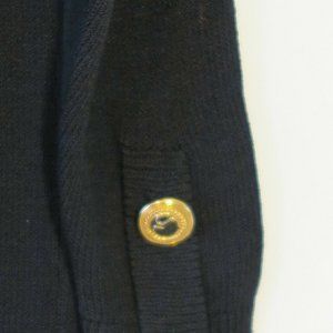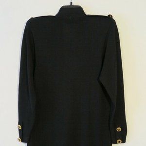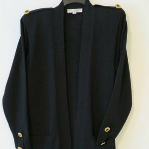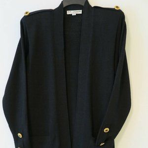 Vintage ST. JOHN SEPARATES Black Open-Front Santana Knit Gold Button Cardigan Size P. Bust is 35" and length is 28.5". 80% wool and 20% viscose rayon. Two front hip pockets. Long sleeves have two gold "SJ" logo buttons at cuffs. Padded shoulders have tabovers with one gold "SJ" logo button. Perfect all season classic St John Santana Knit Cardigan in excellent condition.