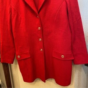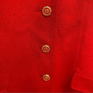 Pre-owned in great condition with no rips but has some stains. Has normal wear. There are stains inside collar and light stains on the left cuff as shown in pictures. Women’s vintage red knit jacket with gold buttons. Made in USA. Please check photos carefully. Selling as-is. Great color for the holidays. Comes from smoke and pet free home.