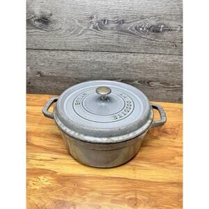 Vintage Staub enameled cast iron round cocotte (Dutch oven) in classic Graphite Grey. Made in France, Staub cookware is known for superior heat retention, durability, and professional-grade performance.