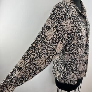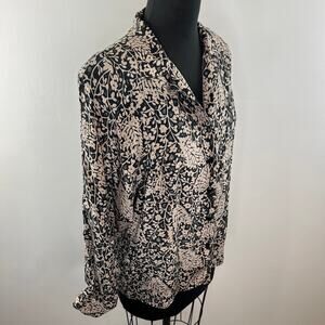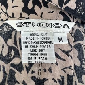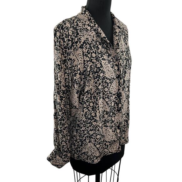 Vintage STUDIO A Tan & Black Floral 100% Silk Long Sleeve Blouse VTG Button-Up M