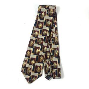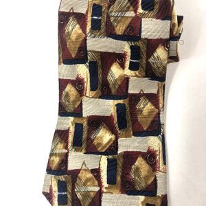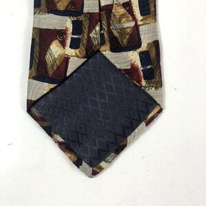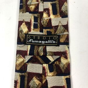 This is a stylish vintage necktie from Studio by Fumagalli's, a brand known for its quality silk neckwear. The tie is 100% Imported Silk printed in Italy, and the tie was Made in USA. The pattern is an abstract, geometric, or "Art Deco" style pattern in multiple colors including cream/tan, burgundy/maroon, navy blue, and gold/brown.