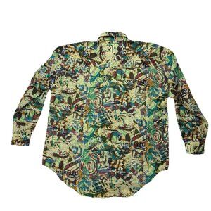 Vintage SUBSTUDIO Mens S Green Abstract Art Silk Button Up Long Sleeve Shirt 90s