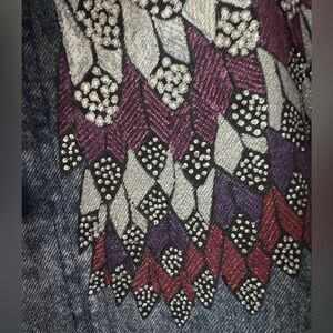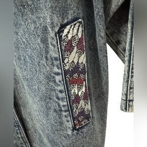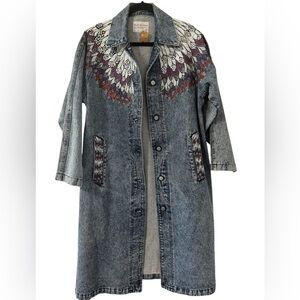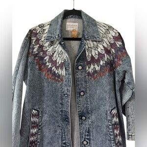 Stand out in this incredible vintage SUNDAY brand acid wash denim coat featuring stunning embroidered feather detail across the shoulders and front pockets. Mid-length with snap button front and relaxed, oversized fit. Perfect for layering in fall or making a bold statement year-round.