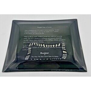 Dish is in good condition, there are no chips or cracks, the gold paint is wearing off, please see photos. Crafted in 1966, this Vintage SUNKIST Smoke Glass & Gold World Saga Of Success dish is a stunning piece of advertising history. The 9"x7" tray features an elegant smoke glass design, complemented by a gold finish that adds a touch of sophistication to its fruit and raisins theme. Proudly made in the United States, this original item is a testament to the era's advertising artistry. The plate's subtle yet impactful message promotes the SUNKIST brand, making it a nostalgic addition to any collection or a unique decorative piece for those who appreciate the blend of vintage style and branding.