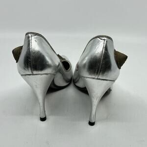 Details: Vintage Susan Bennis Warren Edwards shiny silver heels with a decorative spike at the toe and outer heel. Made in Italy.
