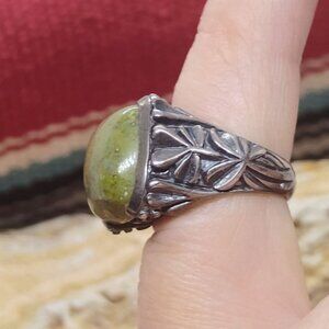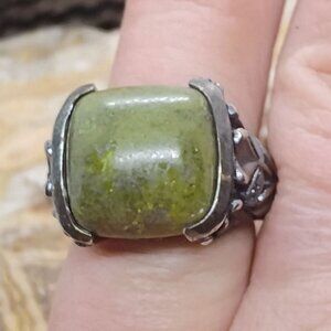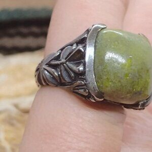 This exquisite Stephen Walsh SW Ireland ring features a lucky clover design crafted from Connemara marble and sterling silver. A perfect blend of vintage charm and Irish heritage, it's a unique accessory for any collection.