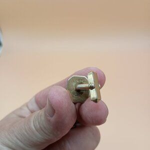 Vintage gold tone and blue glass octagon cabochon cufflinks. Design measures .5". Some scuffs and tarnish. One cufflink has a scratch/dent.