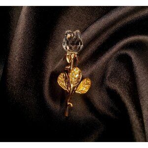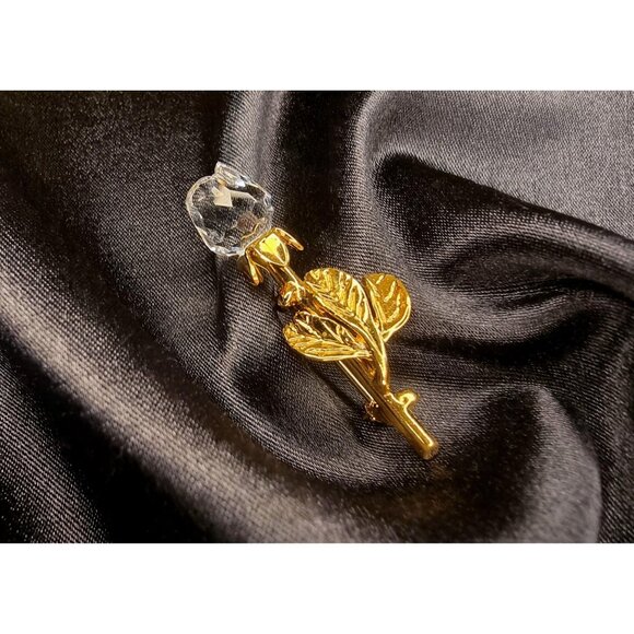 Expertly designed with a gold-tone metal stem and leaves, this brooch showcases Swarovski’s renowned craftsmanship. The rosebud, delicately sculpted from clear faceted crystal, captures and reflects light with dazzling brilliance—each facet hand-cut for exceptional clarity and sparkle. The gleaming gold finish enhances the contrast, giving the piece a luxurious, lifelike depth.