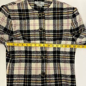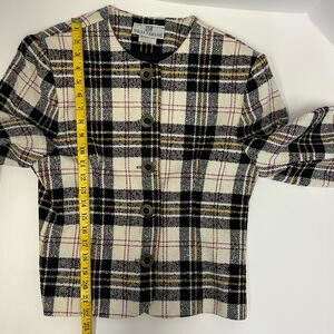 This stylish vintage Sweet Briar women’s plaid blazer is a must-have for any wardrobe! Made in the USA, it features a timeless black, white, yellow, and red plaid pattern with classic button-down closure. The fabric is a premium blend of acrylic, polyester, and wool, offering both comfort and warmth. The blazer is fully lined with acetate and includes a sophisticated round neckline, making it perfect for layering or wearing as a statement piece.