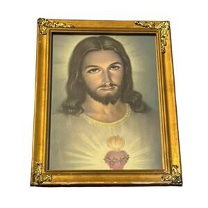 Vintage framed print of the Sacred Heart of Jesus, a classic Catholic devotional image. Features Jesus with radiant heart crowned with thorns and flames. Comes in a gold-tone frame with ornate corner embellishments.