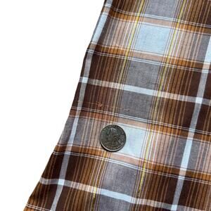 This 70s/80s short-sleeve western shirt features a brown, orange, white, and gold color palette with pearl snap buttons for a classic vintage look. Original size tag has faded; measurements suggest a men's L/XL. Overall condition is good used, approximately 8/10, with light to moderate fabric wear and some marks as shown in photos. Despite minor signs of wear, the shirt’s integrity is strong and ready for wear or collection.