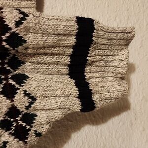 Authentic 90s vintage Saddlebred men’s sweater in a medium size. Features a warm gray ribbed knit with bold black horizontal stripes and classic diamond argyle-style accents. Crew neck with ribbed collar, cuffs, and hem adds structure and comfort. Cozy and nostalgic, this sweater fits right in with current cabincore and grandpacore aesthetics.