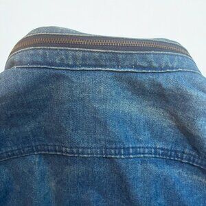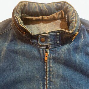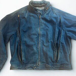 Authentic vintage Saddlery denim jacket, made in the USA. Rare and rugged piece with moto-inspired details. Good vintage condition. Wear and fading throughout (see photos), small scuffs, and distressing add to the vintage character.