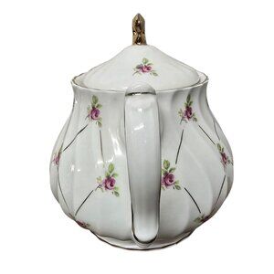 This vintage teapot features a delicate floral design with pink roses on a white porcelain base. Its elegant gold trim adds a touch of sophistication, making it suitable for refined tea gatherings or as a decorative piece in your collection. A timeless addition for those who appreciate classic designs.