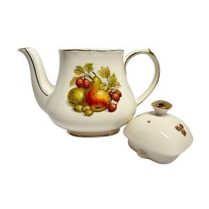 Add a touch of vintage charm to your collection with this beautiful Sadler teapot. Made in England, this teapot features a delightful fruit motif on both sides, highlighted with gold trim for an elegant finish. Despite some imperfections, it remains a lovely piece for both display and functional use.