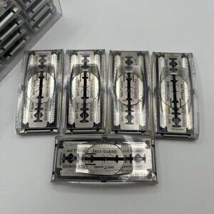 Each clear plastic case contains 4 stainless steel double-edge blades, coated with Teflon for smoother shaves and marked with built-in face guards for added safety.