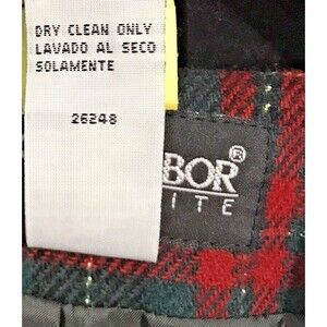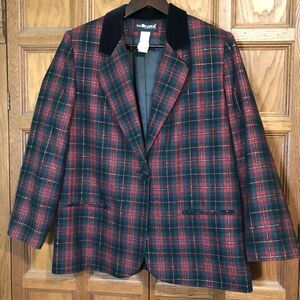 Vintage Sag Harbor Blazer. Women's size 14, Red, Green Black Tartan Plaid with a Gorgeous Gold Thread running through it. (I could not for the life of me get the Gold Thread to sparkle and glitter like it does on my camera images.) 90s Wool Blend Jacket with Single Button Closure, Faux Pockets, Lined, Should Pads, will go with anything, pants, skirt, over a dress. So pretty for the Holidays... Christmas is Coming!!! Will ship carefully boxed.