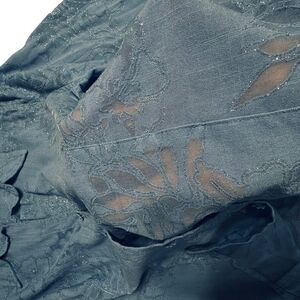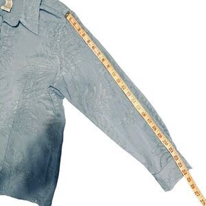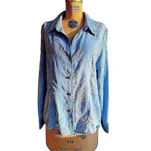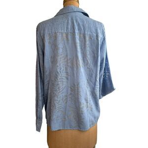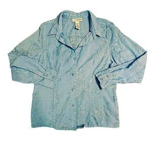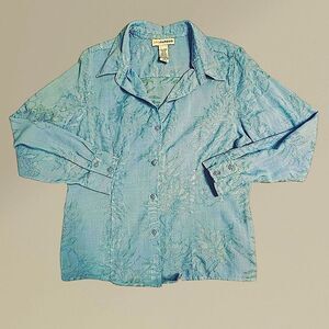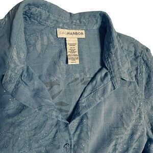 Vintage Sag Harbor Blue Semi sheer glittery long sleeve shirt button down size 16 with self floral cut out pattern. Lightweight fabric with cute flower shape buttons, double button cuffs.