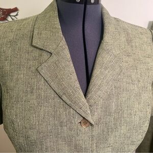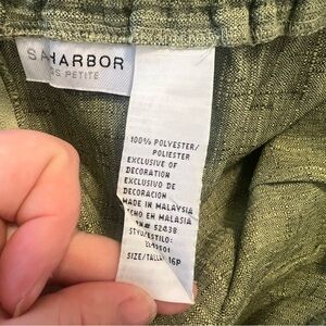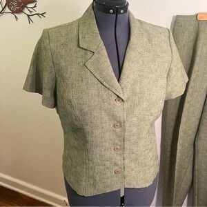 Good condition, has one small spot as shown. Vintage. Sag harbor. Skirt & pant suit. Green with black details. Top is short sleeve. Button down. Shoulder pants. Pants are pull on, side zip. Pencil skirt with back zip. Slit in back. Style 22-53501. Size 16 petite. 100% polyester. Top Pit to pit laying flat 21” shoulder to hem 22” sleeve (shoulder seam to hem) 8” Pants Waist 16” Inseam 27” Front Rise 13” Skirt Waist 15” Waist to hem 31”. All measurements are approximate and taken lying flat. Smoke free home. No trades, offers welcome.
