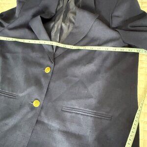This elegant navy blazer offers a classic silhouette, featuring gold-tone buttons and a tailored fit. Its timeless design reflects refined vintage charm and quality.