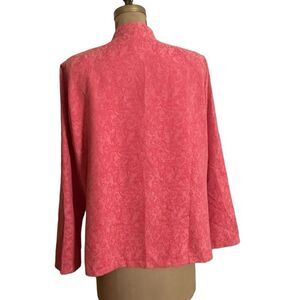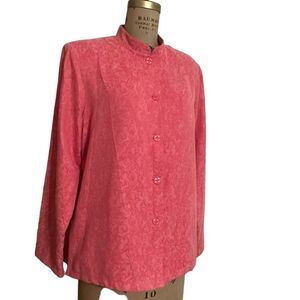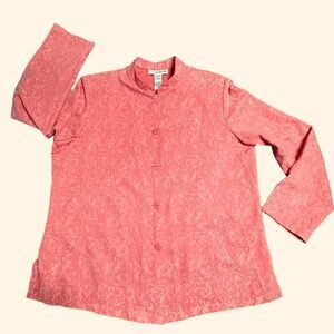 Vintage Sag Harbor Pink Paisley floral suedette long sleeve band or mandarin collar shirt size 16 . Unlined Jacket, Shacket, Tunic Shirt . In excellent condition. self floral patterned textured suede feel medium weight polyester fabric .