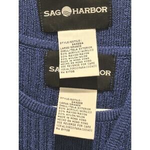 The Vintage Sag Harbor Royal Blue Sweater Set in size Large for women features a solid pattern with a round neckline. The two-piece set includes a short-sleeved top and long-sleeved outer layer. Made from a blend of nylon, rayon, and acrylic, this retro sweater set is perfect for winter, fall, and spring seasons. The brand, Sag Harbor, adds a touch of nostalgia to this stylish and versatile sweater set, making it a timeless addition to any woman's wardrobe.