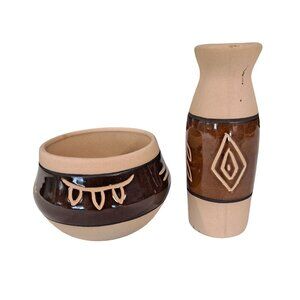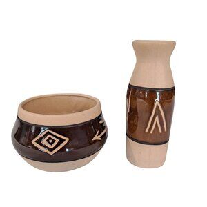 Vintage Saguaro Stoneware Studio Art Pottery Vase And Bowl Native American Symbols Made in Phoenix Arizona. Please see close up of photos for some staining and scuffs.