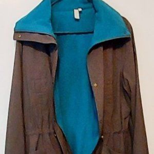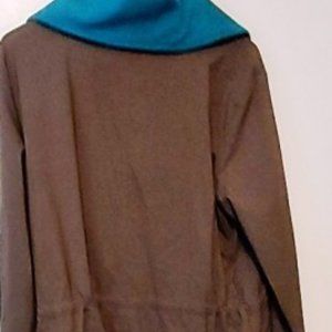 This is a very nice Sahalie jacket. In very good condition. Snaps to close and 2 pockets in front. Pretty blue/ green fleece lineing. Draw string to tighten waist. Full Ziped front. Easy Care & Warm Vintage.