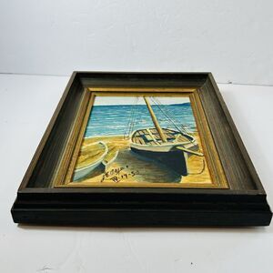 Vintage Sailboat on Beach Oil Painting Signed JE Ayers Framed 9X11" Dated 1953