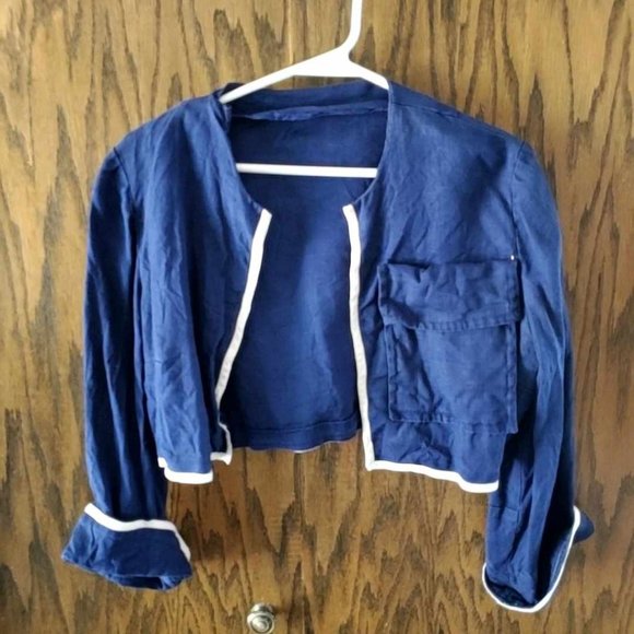 This cute jacket is made of heavy cotton, with elbow length sleeves, and a large pocket over the left breast. The white trim gives a sailor vibe and is very fun for cocktail parties. Fits a size 12. No front closure, it's meant to be worn open. It's a bit wrinkled from being in storage during a move but a good steam will take those out.