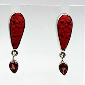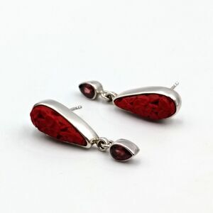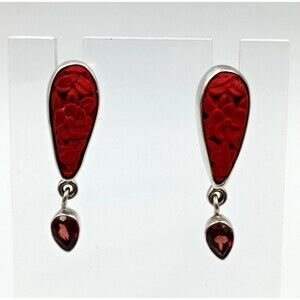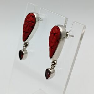 Vintage Sajen Sterling Silver 925 Carved Cinnabar Garnet Dangle Earrings