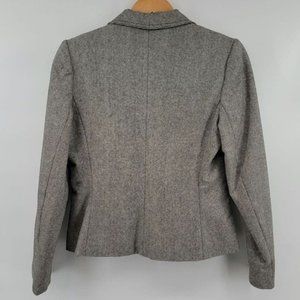 Chic, vintage Sakowitz grey tweed wool skirt suit in size 8. Features a tailored fit and elegant button details, perfect for stylish women with a taste for classic fashion.