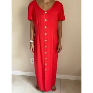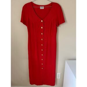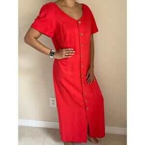 Vintage Saks David Warren Linen Blend Short Sleeve Sheath Dress in Red with Gold Buttons. No size tag, fits like a Size Medium (8-10). Please see measurements below for reference. Includes shoulder pads and is fully lined.