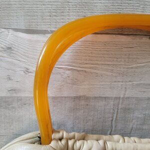 This vintage handbag exudes sophistication with its beige leather body and striking amber bakelite handles. The addition of a matching coin purse enhances its utility, while the Saks Fifth Avenue label speaks to its high-end quality and timeless appeal.