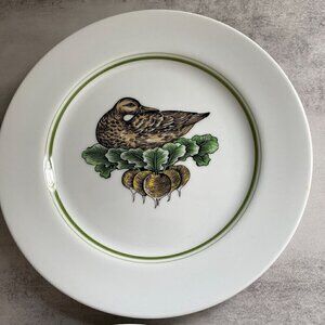 Whimsical set of four ceramic plates featuring birds with various fruits and vegetables. Very useful neutral tones so will go with just about any tabletop dining theme.