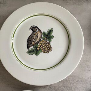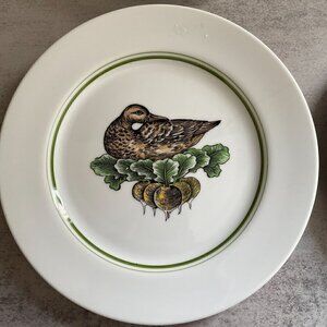 Whimsical set of four ceramic plates featuring birds with various fruits and vegetables. Very useful neutral tones so will go with just about any tabletop dining theme.
