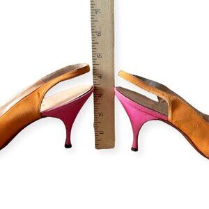 Vintage Saks Fifth Avenue Slingback Heels | Orange Pink Satin | Clear Vinyl Inset