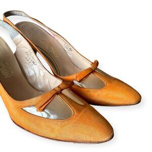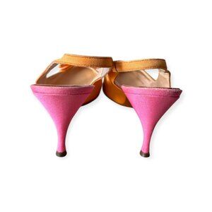 Vintage Saks Fifth Avenue Slingback Heels | Orange Pink Satin | Clear Vinyl Inse