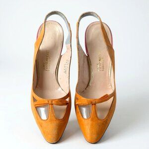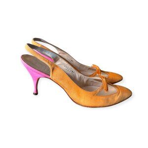 Step into vintage elegance with these stunning Saks Fifth Avenue slingback heels. Likely dating from the late 1950s to early 1960s, these statement shoes feature a striking contrast of orange fabric uppers with clear vinyl insets, finished with chic pink heels. A delicate front bow adds a feminine touch, while the pointed toe elongates the silhouette.