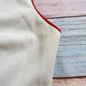 Embrace nostalgia with this vintage Saks Fifth Avenue activewear sleeveless dress. Featuring a classic V-neck and vibrant red and blue zigzag detail, it captures the active sportswear style of yesteryears. Crafted for those who appreciate timeless fashion, this piece evokes a sense of history and elegance, perfect for vintage enthusiasts.