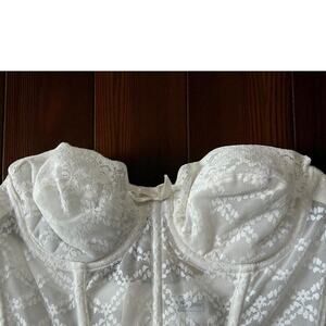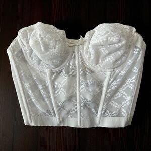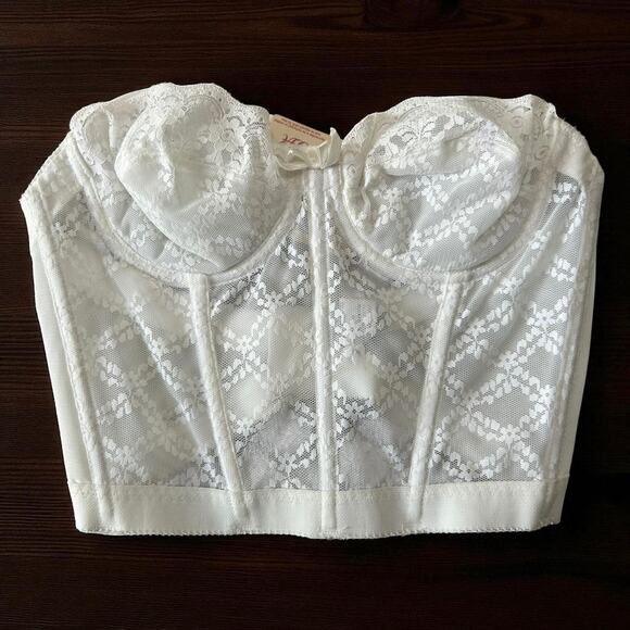 Vintage Saks Fifth Avenue White Lace longline strapless corset style bustier in a women's size 36A. This item is deadstock/new with tags. There is a very faint, slightly blue spot on the fabric around the seam of one cup.