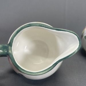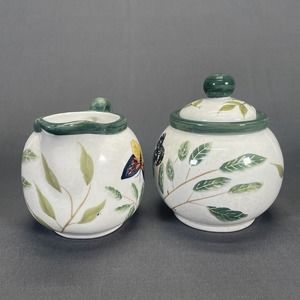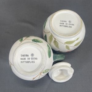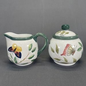 Beautiful creamer and sugar bowl with lid made by Sakura. The set is in the butterflies pattern and has no chips or cracks. Creamer measures 3 1/2 inches in height and 3 1/2 inches in width. Sugar bowl with lid measures 4 1/2 inches in height and 4 inches in width.