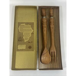 Vintage Salad Server Set African Kenya Mvule Wood Fork Spoon New w/Box
