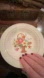 Set of four Salem China Co. large rim vintage soup bowls featuring a charming floral basket design that resembles cross stitch and gold rim detailing.