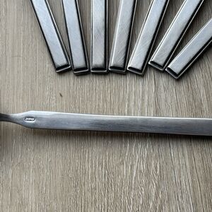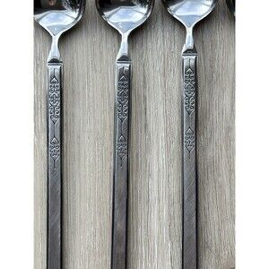 This is a beautiful and collectible set of eight Vintage Salem Stainless flatware pieces in the Scrolls pattern, crafted in Japan. These are long iced tea spoons, also known as parfait or stirring spoons, measuring approximately 7.5 inches long. The handles feature a distinctive geometric design with detailed scrollworka perfect touch of Mid-Century Modern (MCM) style. The stainless steel set is in excellent used condition with only minor, age-appropriate wear. A superb addition for collectors or daily use.