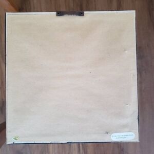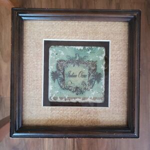 The tile measures approximately 3 3/4" square and comes ready to hang behind glass in a woven-look tan matted brown wood shadowbox frame that measures 8 1/4" square.
