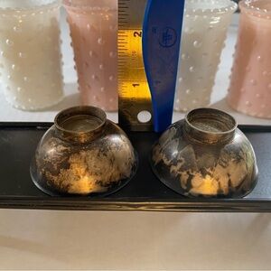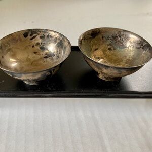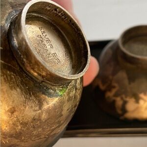 Vintage Silver EP salt and pepper cellar made in Japan. Original packaging. Needs cleaned but a very nice unique set to own. Measures about 1” high x 2” wide.