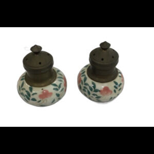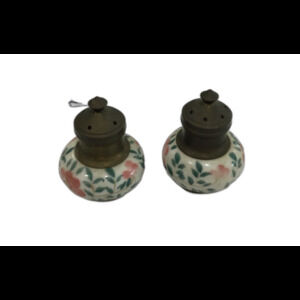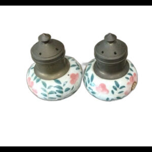 Vintage Salt & Pepper Shakers. Please reference attached pictures for painted floral design, brass tops, condition and approximate sizes.